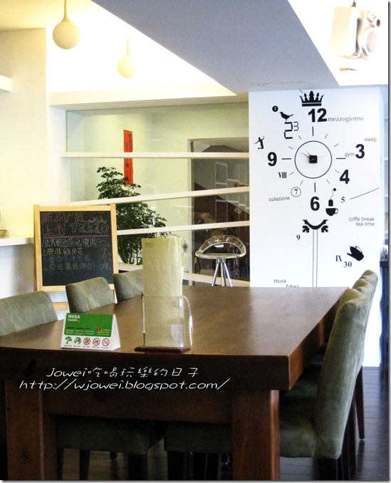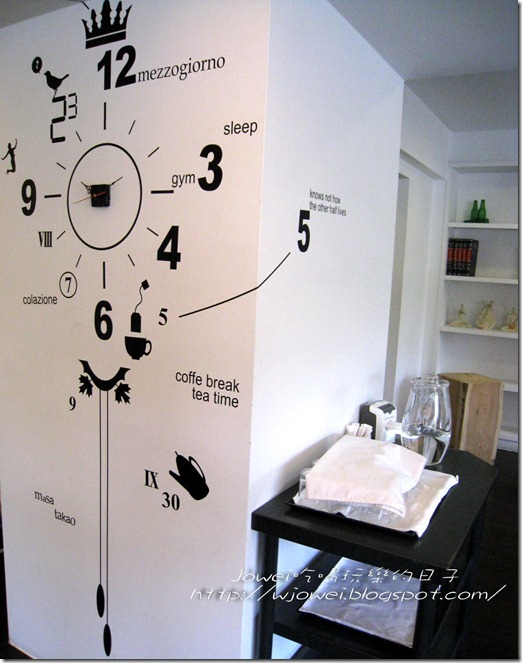Jowei對牆面上具有設計感的大鐘一直很有興趣,該睡覺該喝茶都會告訴你~一旁還附有自助式的茶水~