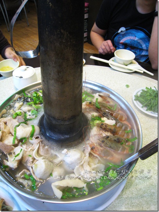 酸白菜白肉鍋(中),內容有酸白菜、白肉、蝦子、蚵仔、凍豆腐、大腸頭、蛤蜊以及肚片等一大堆料,熱呼呼的湯頭在冷冷的天氣中還挺吸引人,先喝一口湯,酸的很夠味!!